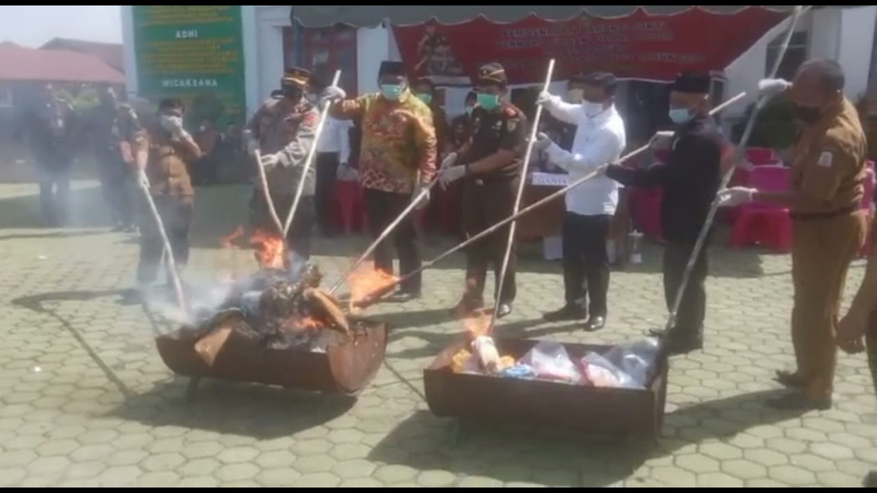 Pembakaran dua jenis narkotika dan obat-obatan terlarang (narkoba) itu dilakukan serangkaian pemusnahan barang bukti (BB) dalan kasus tindak pidana narkotika, yang ditangani pihak Kejaksaan Negeri Singkil (Kejari) sejak Januari hingga Juli, sepanjang tahun 2021.