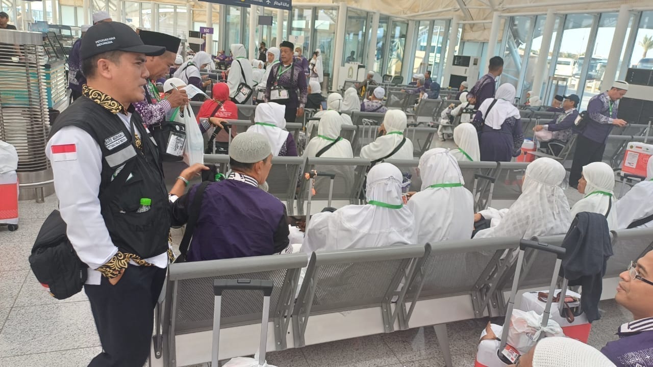 MADINAH | Sebanyak 360 Jemaah Calon Haji (JCH) tergabung dalam Garuda Airlines 3102 asal Bandara Kuala Namo (KNO) Embarkasi Medan tampak begitu bersemangat saat tiba di Faviliun Hajj Bandara AMAA Madinah, Arab Saudi, Selasa (14/05).
