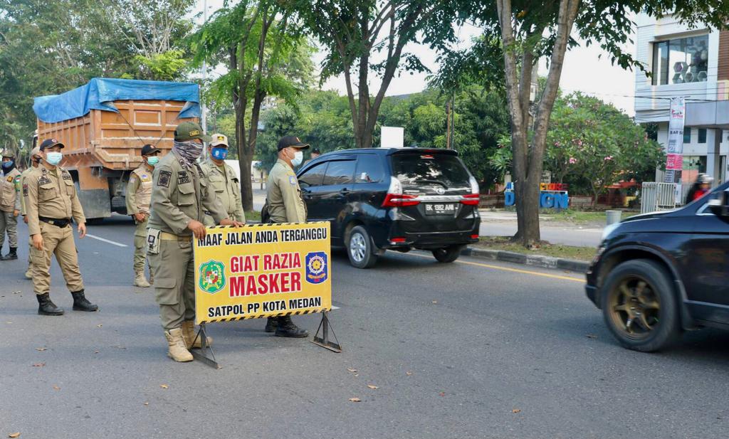 MEDAN|- Sebanyak 55 orang warga terjaring ketika Tim Satgas Covid-19 Pemko Medan menggelar razia masker di Jalan Ring Road Gagak Hitam, persisnya depan Ringroad City Walk (RCW), Senin (28/12/2020). Sebagai sanksi atas pelanggaran yang dilakukan warga karena kedapatan tidak mengenakan masker,tim yang terdiri dari unsur Satpol PP Kota Medan, Dinas Pariwisata serta Badan Penaggulangan Bencana Daerah (BPBD) menahan sebanyak 8 kartu identitas diri (KTP).