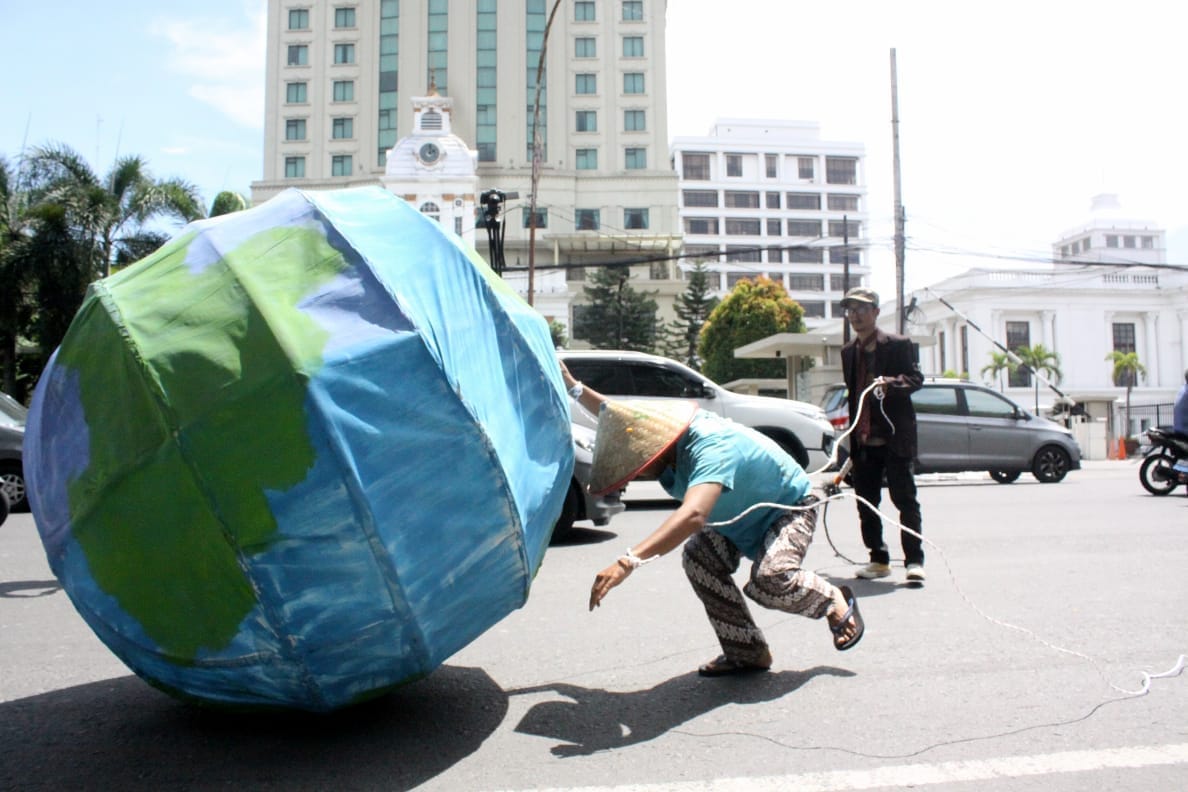 Aksi yang digelar di depan Pos Block sambil melakukan orasi kemudian long march mendorong Bola Bumi mengelilingi Lapangan Merdeka Medan dengan melakukan teatrikal