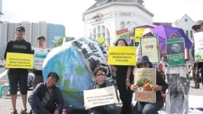 MEDAN | Memperingati Hari Bumi 2024, puluhan massa dari berbagai elemen aktivis lingkungan menggelar aksi di depan Pos Block Medan, Senin (22/4/2024).
