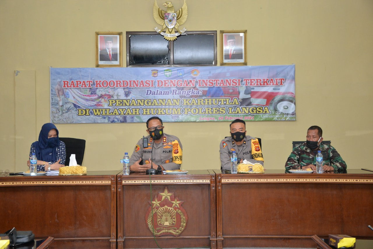 LANGSA | Polres Langsa menggelar rapat koordinasi (Rakor) penanganan Kebakaran Hutan dan Lahan (Karhutla), Kegiatan dilaksanakan di Aula Mapolres Langsa menghadirkan seluruh dinas dan instansi terkait. Jum’at (26/2/2021).