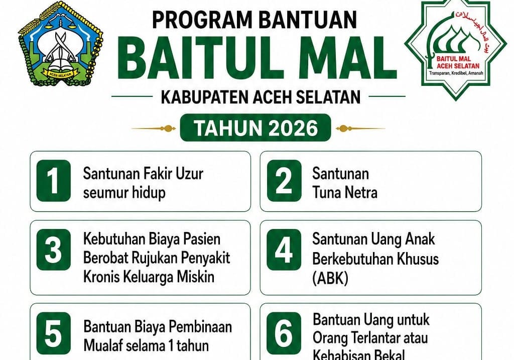 Baitul Mal Kabupaten Aceh Selatan menghadirkan 17 Program bantuan pada tahun 2026. YUNARDI.M.IS