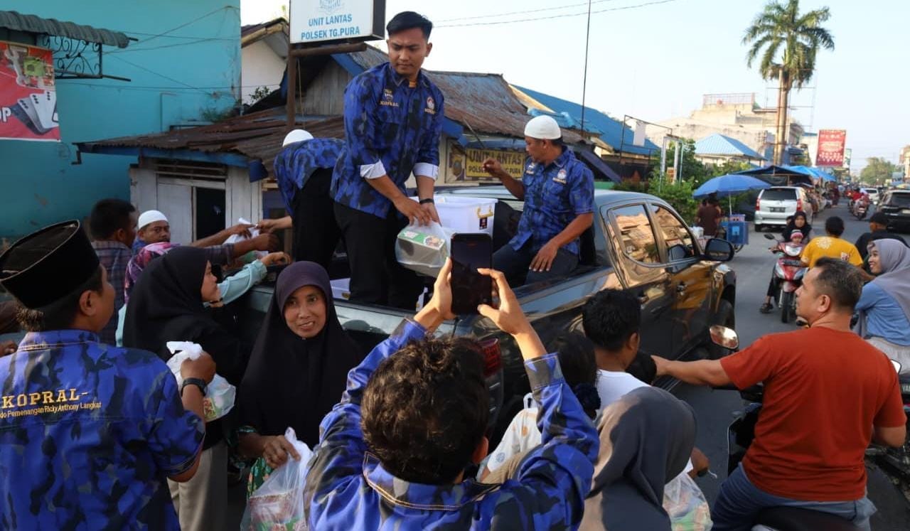 LANGKAT | Dewan Pimpinan Darah Komado Bela Tanah Air (DPD KOMBAT) Langkat menggelar bakti sosial, Minggu (7/3/2026) sore. Sedikitnya, 1.447 paket takjil dan ari mineral kemasan dibagikan pada momen Ramadhan 1447 H tahun ini di seputaran Tanjung Pura.