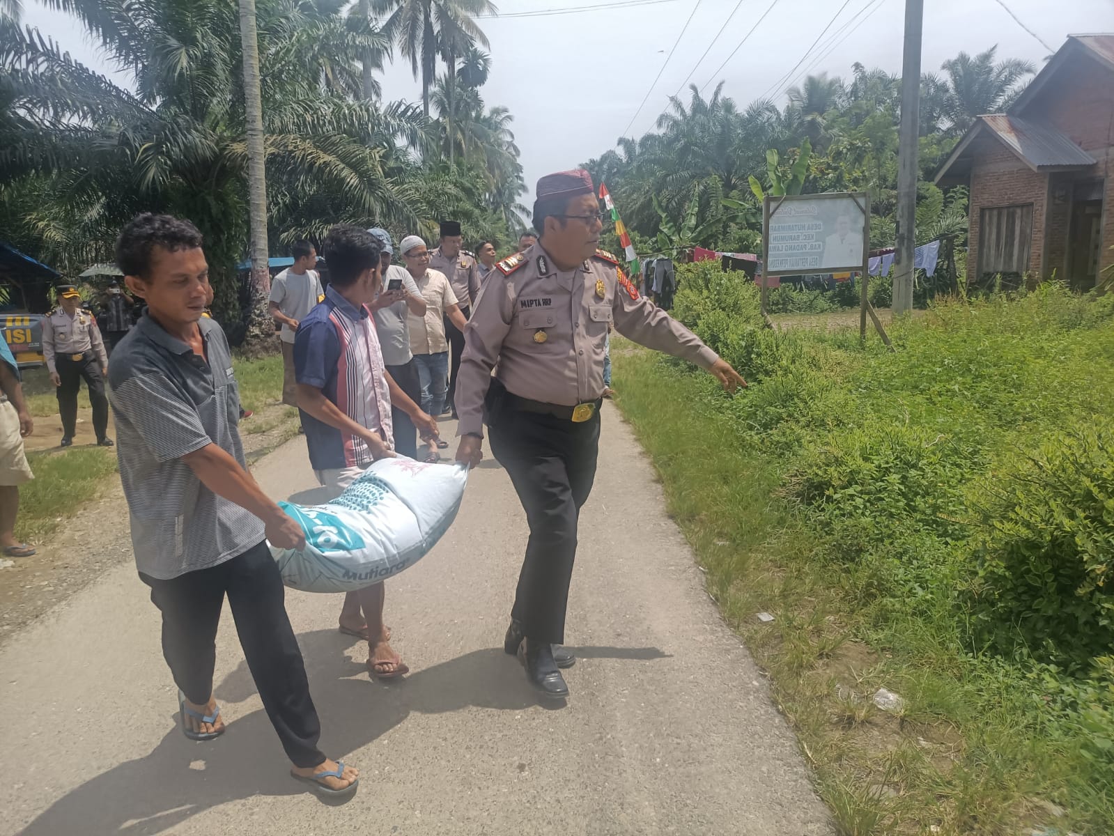 Kapolsek Barumun AKP Miptahuddin menenteng satu karung pupuk NKP bantuan Kapolres Palas AKBP Diari Astetika, bersama sejumlah petani cabai kurang mampu di Desa Hutaimbaru. (Foto/Ist)