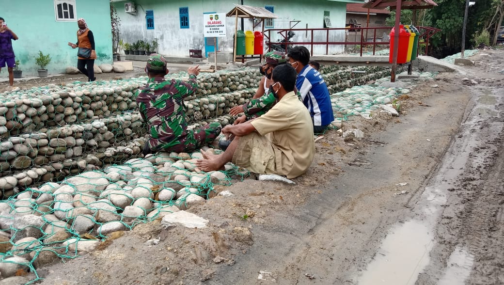 Beberapa warga sedang asik duduk duduk santai sambil bersenda gurau di pinggiran sungai, yang telah di bangun beronjong oleh Satgas TMMD Kodim 0201/BS.