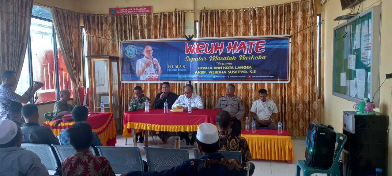 Dalam kesempatan tersebut, Kepala BNNK Langsa AKBP Werdha Susetyo SE. Sebelum tibanya waktu sholat Jum’at, secara tidak langsung menyampaikan ceramahnya terkait bahayanya narkoba memberikan sosialisasi, memberikan himbauan untuk pengawasan tidak beredarnya Narkoba di Aula Kantor Geuchik Simpang Wie, kegiatan tersebut, turut dihadiri Ketua Gerakan Anti Narkoba (Granat) Langsa Islamsyah, Geuchik Simpang Wie, Ibnu Abbas SP, Sekretaris Gampong, Imam Chik Gampong, Imam Dusun Gampong, Tuha Peut, Babinsa Koramil Langsa Timur, Babinkamtibmas Polsek Langsa Timur, dan Para Perangkat Pemerintahan Gampong.