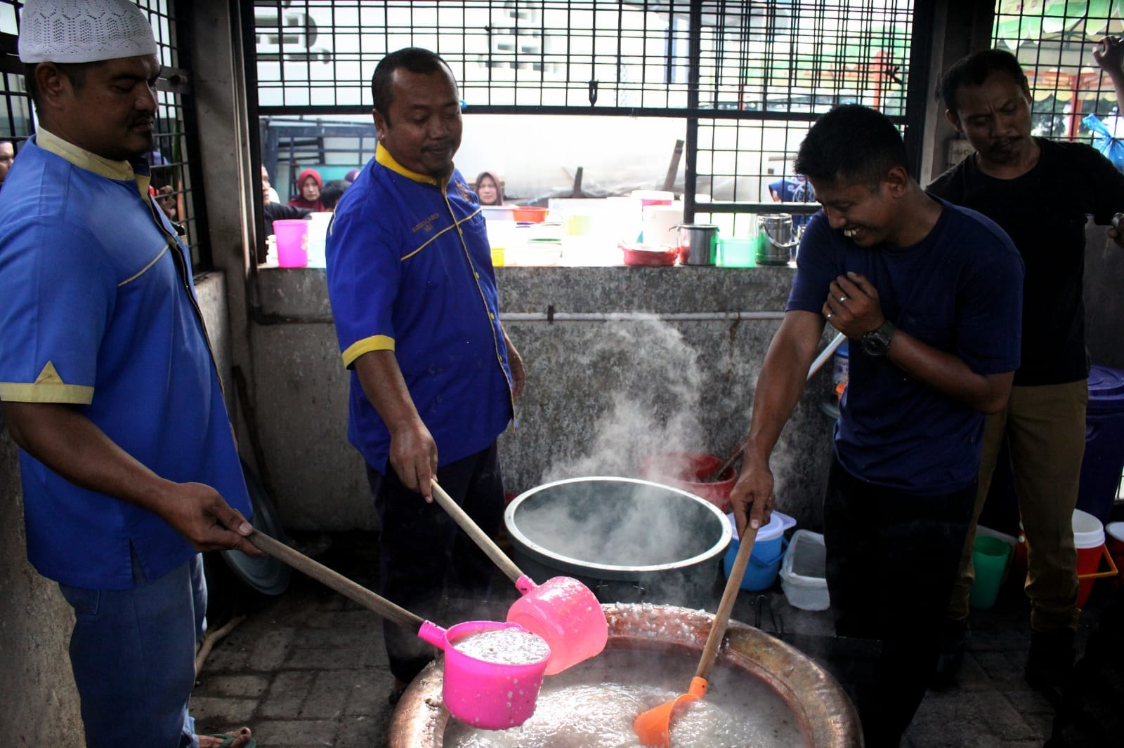 Bubur ini Kita bagi dua sebahagian untuk masyarakat yang membawa pulang dan sebahagian lagi kita siapkan buat yang berbuka puasa di mesjid ini,” Ujarnya.
