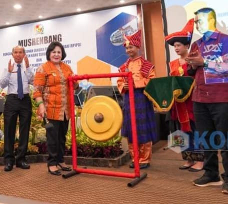 Bupati Karo Cory Sriwatu S3bayang pukul gong saat membuka Musrenbang) RPJPD) Kabupaten Karo Tahun 2025 -2045