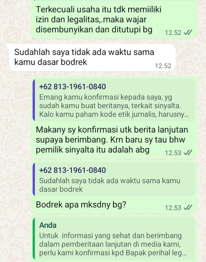 Dalam chat lanjutan, RA bahkan menegaskan bahwa wartawan tidak memiliki hak untuk mempertanyakan izin perusahaan miliknya.