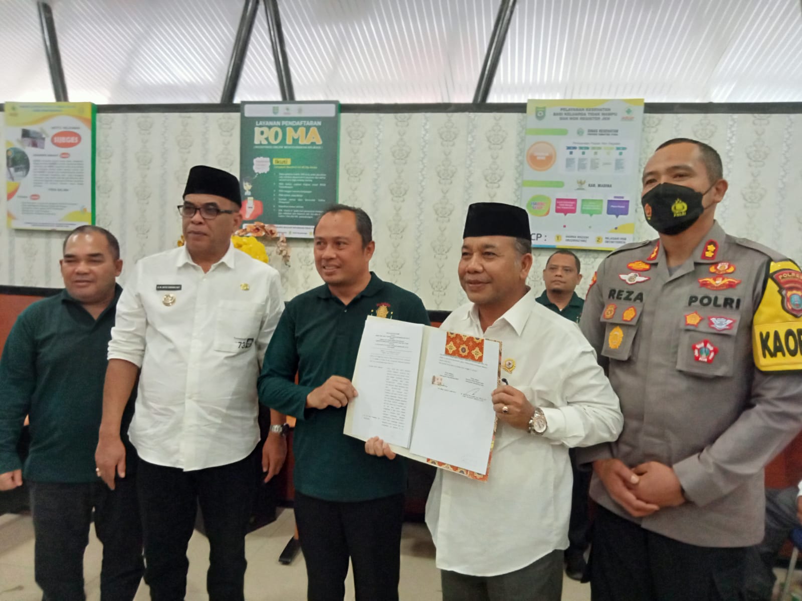 MADINA | Bupati Mandailing Natal (Madina) HM.Jafar Sukhairi Nasution menghadiri Penandatanganan Perjanjian Kerja Sama (PKS) antara Badan Amil Zakat (Baznas) Madina dan Rumah Sakit Umum Daerah (RSUD) Panyabungan di Aula RSUD Panyabungan, Rabu (3/8/2022).
