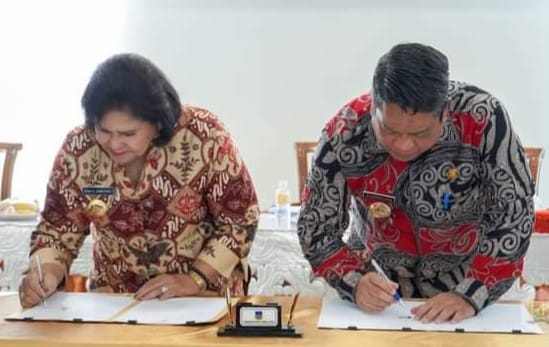 KARO I Bupati Karo, Cory Sriwaty Sebayang teken nota kesepahaman kerjasama dengan Pemerintah Kota Tebingtinggi tentang Sistem Informasi Ketatalaksanaan, Analisa Jabatan, Beban Kerja, Akuntabilitas Kinerja, dan Reformasi Birokrasi (SITALAKBAKUNREB) Jumat, di Balai Kota Tebingtinggi.