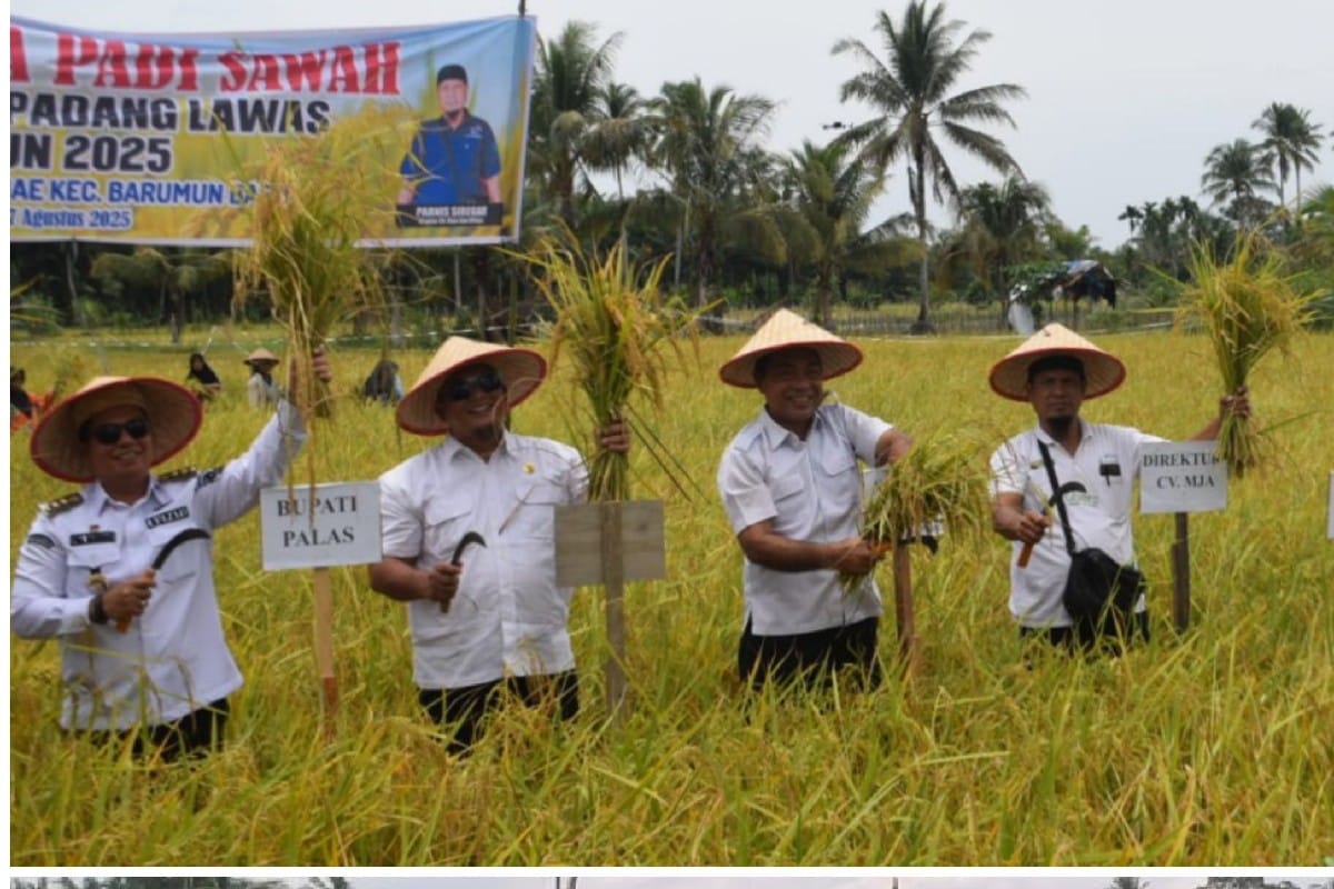 PALAS | Bupati Padang Lawas (Palas) Putra Mahkota Alam Hasibuan menghadiri acara panen raya padi bersama petani di Desa Hasahatan Jae, Kecamatan Barumun Baru, Rabu (27/8).