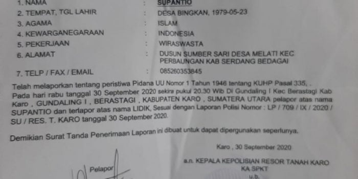 “Hampir 100 orang datang ke villa dan menyuruh kami segera pergi meninggalkan villa itu. Ada yang membawa parang, tombak dan kayu,” katanya ditemui di halaman Mapolres Tanah Karo usai membuat Laporan Polisi.