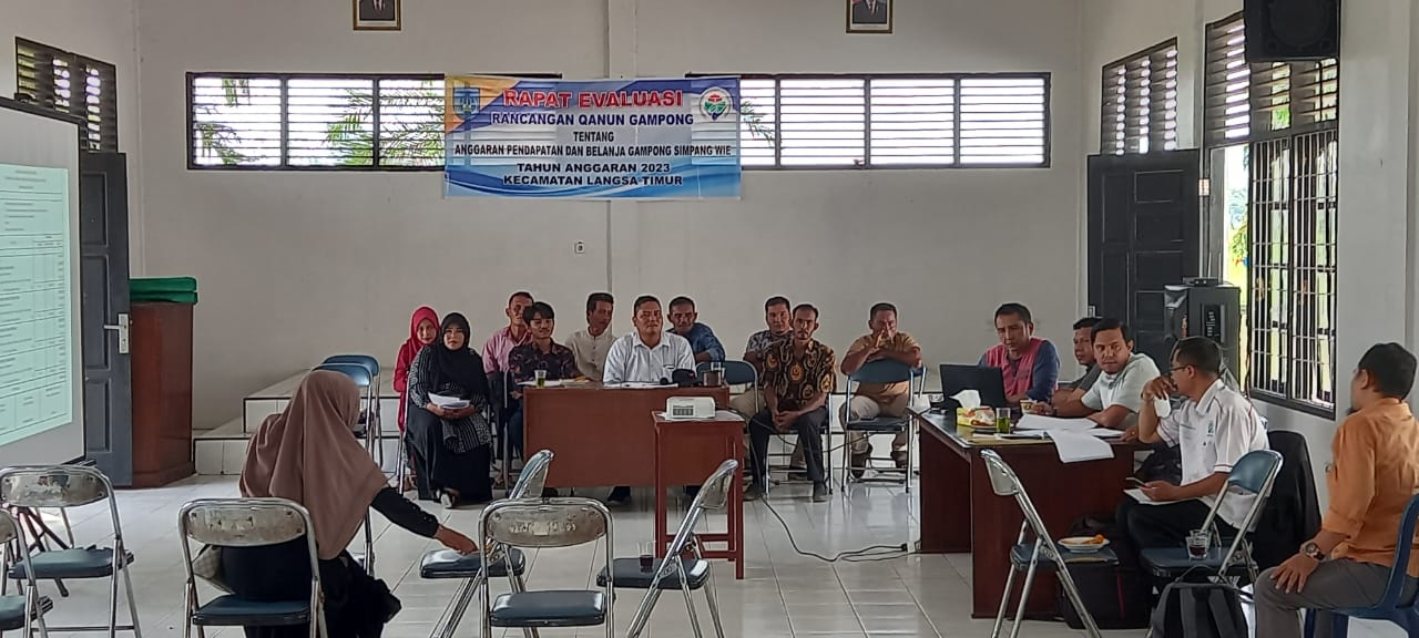 LANGSA | Perangkat Pemerintahan Gampong Simpang Wie seperti Geuchik, Sekdes, para kaur, kepala dusun dan tuha peut di kemukiman Seuneubok Kecamatan Langsa Timur, mengikuti Rapat Evaluasi Rancangan Qanun Gampong penggunaan dana desa tahun 2023 di Aula kantor camat setempat, Jumat 24 Februari 2023.