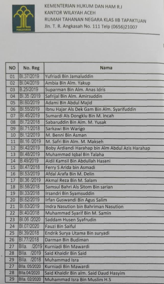 ACEH SELATAN : 29 Narapidana (Napi) di Rumah Tahanan (Rutan) Kelas II B Tapak Tuan dibebaskan.