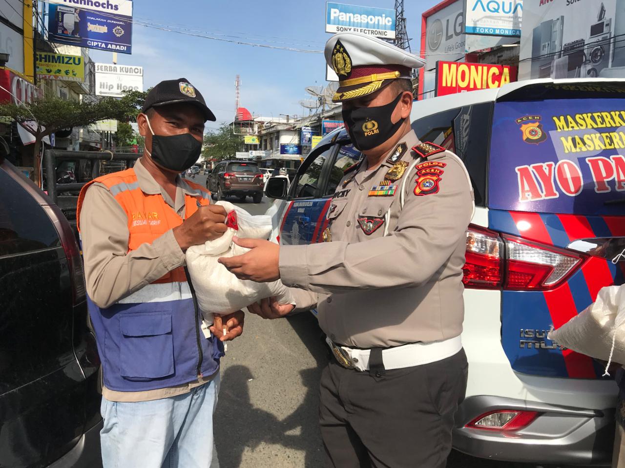 Dirlantas Polda Aceh Bagi Sembako dan Masker ke Warga