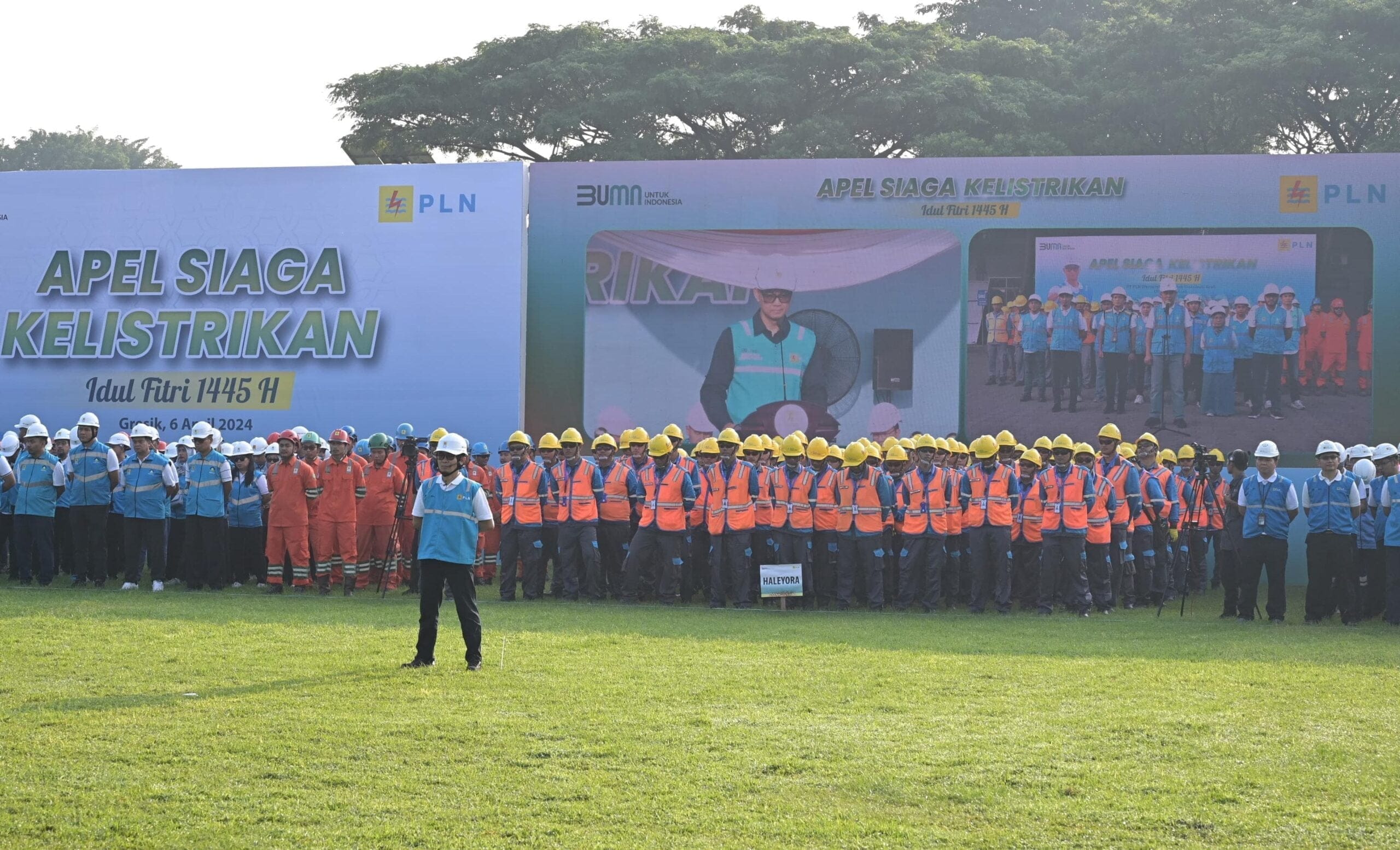 GRESIK| Direktur Utama PT PLN (Persero) Darmawan Prasodjo memimpin langsung kesiapan dan keandalan listrik menyambut momen Hari Raya Idul Fitri 1445 Hijriah dalam agenda Apel Siaga Kelistrikan Nasional yang berpusat di Pembangkit Listrik Tenaga Gas dan Uap (PLTGU) Gresik, Jawa Timur pada Sabtu (6/4).