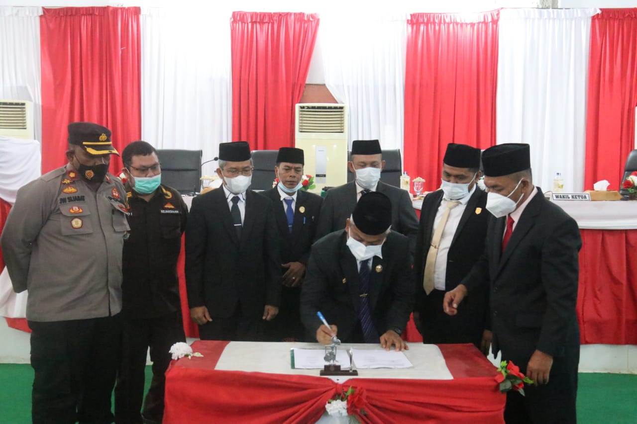 Wakil Bupati Palas drg. H Ahmad Zarnawi Pasaribu, bersama Ketua DPRD Palas Amran Pikal Siregar, saat menandatangani nota kesepakatan Peraturan daerah, tentang pertanggungjawaban APBD Palas, tahun anggaran 2020, di ruang rapat paripurna Gedung DPRD Palas, Sibuhuan, Kecamatan Barumun, Rabu (23/6/2021)