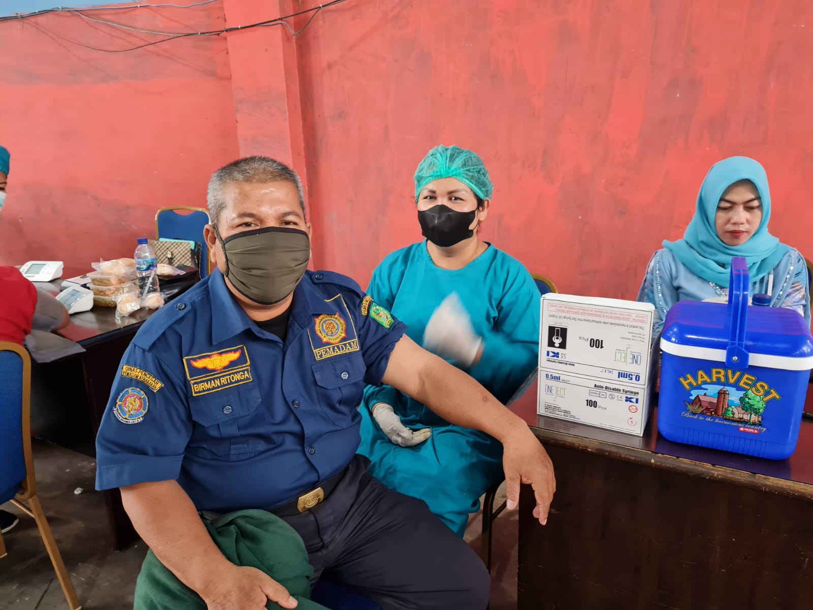 MEDAN I Jajaran pegawai Dinas Pencegahan Pemadam Kebakaran (P2K) Kota Medan menerima suntik vaksin dosis III atau booster di kantor P2K, jalan Candi Borobudur, Medan, Kamis(10/2). Dari 260 orang pegawai sebanyak 120 orang menerima suntikan vaksin yang dilakukan oleh Dinas Kesehatan Kota Medan.