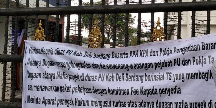 Dalam pernyataan sikapnya massa Geramsu menyebut adanya oknum di Dinas PUPR Deli Serdang yang melakukan pembagian voucher proyek kepada oknum pengusaha tertentu yang selama ini menjadi ‘peliharaan’ oknum pejabat di Dinas PUPR Deli Serdang tersebut.