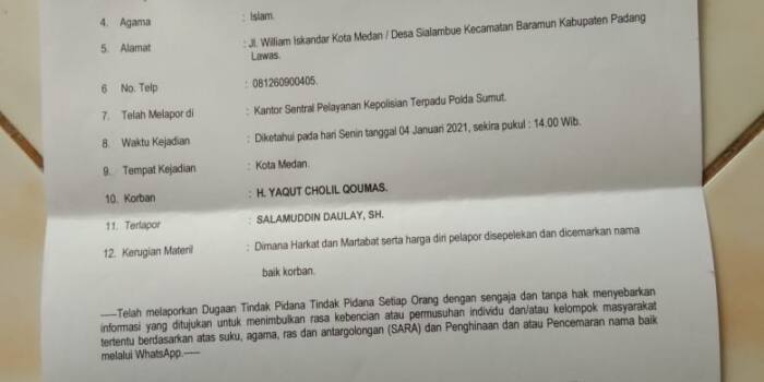 ” Salamuddin diperiksa Unit Cyber Crime Ditkrimsus atas laporan PW GP Ansor Sumut Nomor LP/25/I/2021/Sumut/SPKTI tanggal 7 Januari 2021,” kata Kamil.