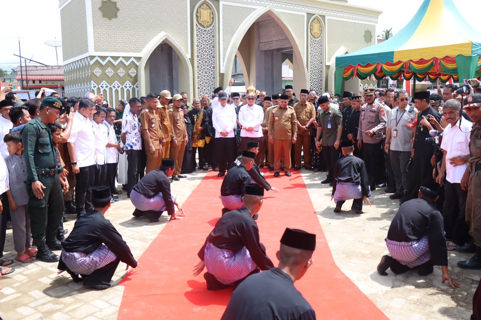 Wakil Menteri Pertanian (Wamentan) Republik Indonesia (RI) Harvick Hasnul Qolbi, didampingi Pj Gubernur Aceh Ahmad Marzuki dan Pj Bupati Abdya Darmansah saat tiba perayaan maulid Nabi Muhammad SAW di Kompleks Masjid Agung Baitul Ghafur Abdya disambut adegan seni Pencak Silat Gelombang