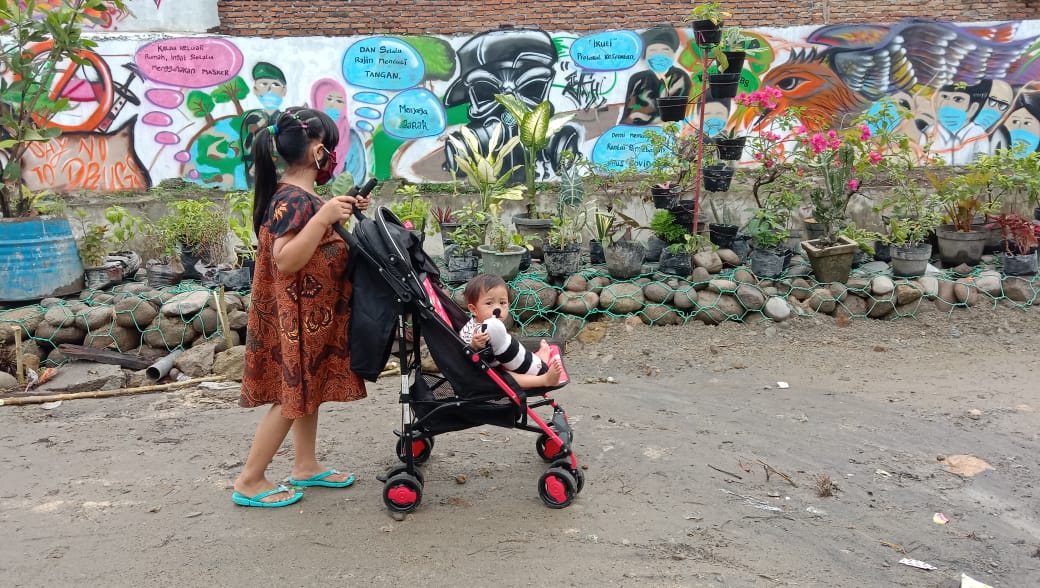 Dalam kegiatan ini, terlihat anak-anak tersebut sedang membawa adiknya bermain sambil melihat pemandangan dipinggiran bronjong sungai yang penuh lukisan dan dihiasi bunga.