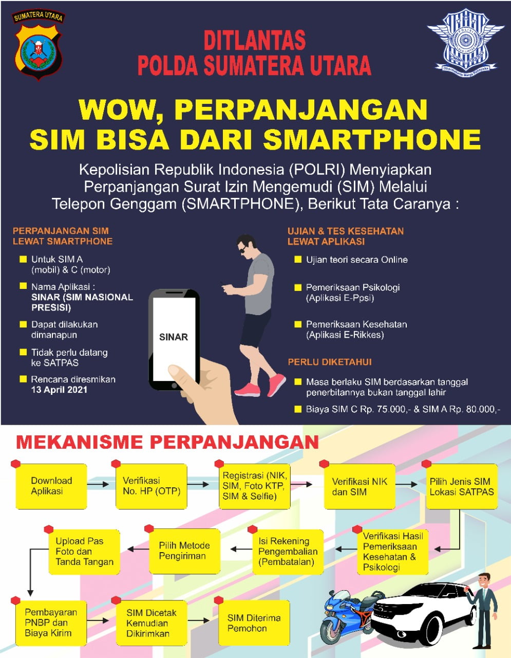 Layanan pembuatan SIM C dan A melalui smartphone itu, kata Valentino, masyarakat hanya perlu mengunduh aplikasi Sinar (SIM Nasional Presisi) dan bisa digunakan mulai 12 April 2021.