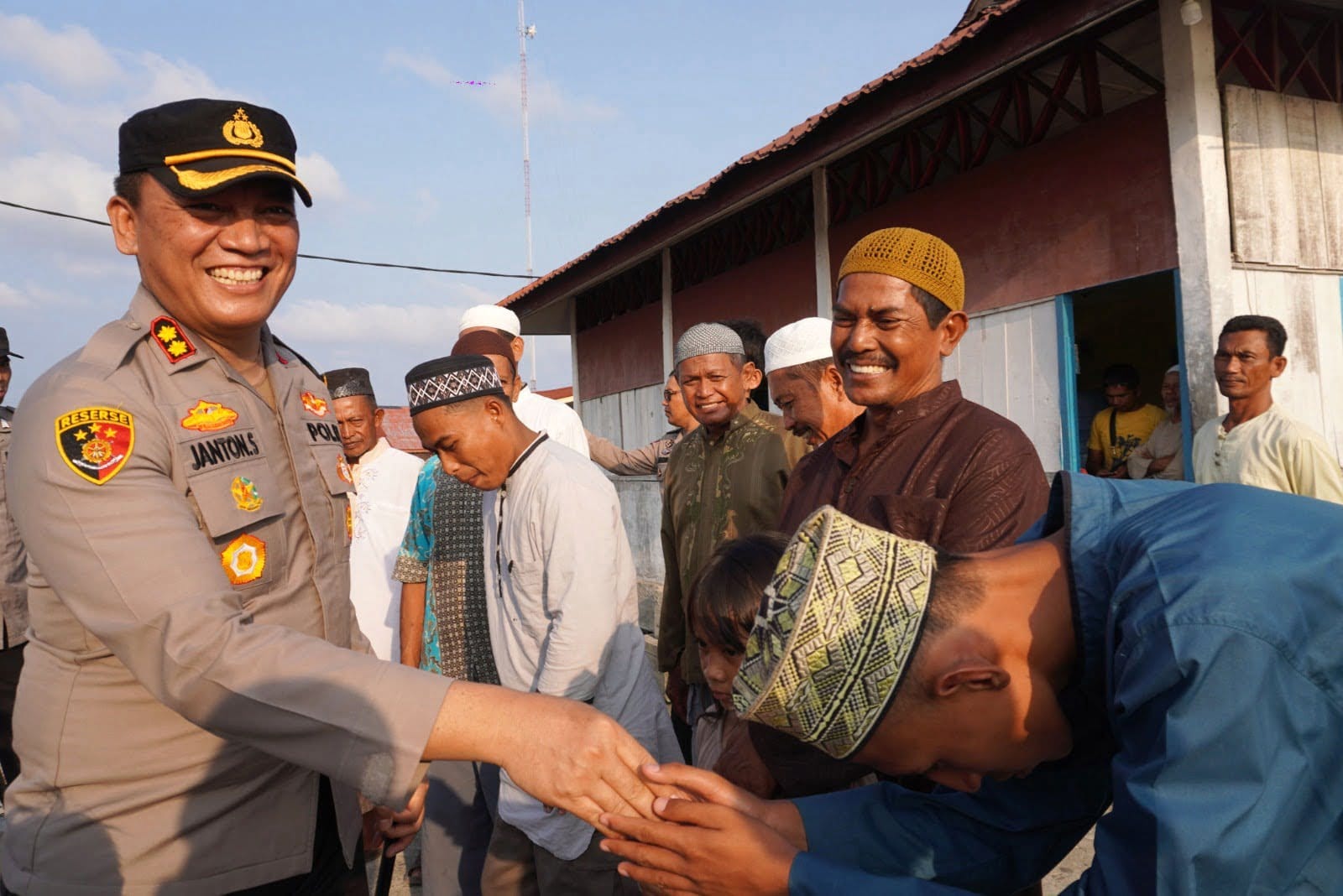 Kapolres beserta dengan ibu Bhayangkara dan jajarannya berangkat ke Kampung Nelayan menggunakan sampan boat. Setibanya di lokasi, AKBP Janton Silaban langsung memberikan bantuan sembako ke pada masyarakat. Bahkan Kapolres membagikan sembako kepada nelayan yang baru pulang melaut di atas sampan.