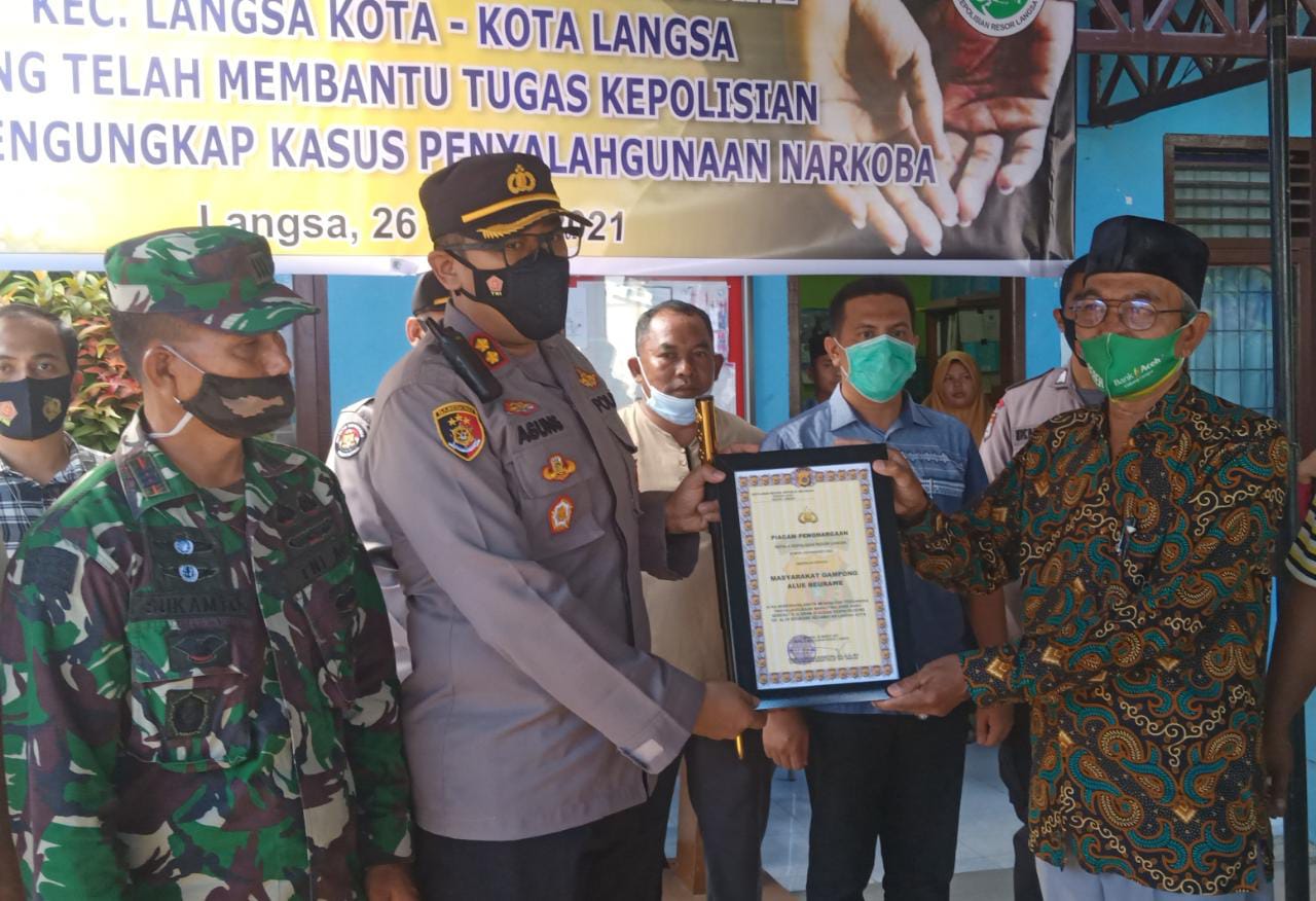 Kegiatan tersebut, Kapolres Langsa juga memberikan Reward sekaligus penghargaan kepada Masyarakat Gampong. Alue Beurawe yang di wakilkan oleh Geuchik (kepala desa) setempat.