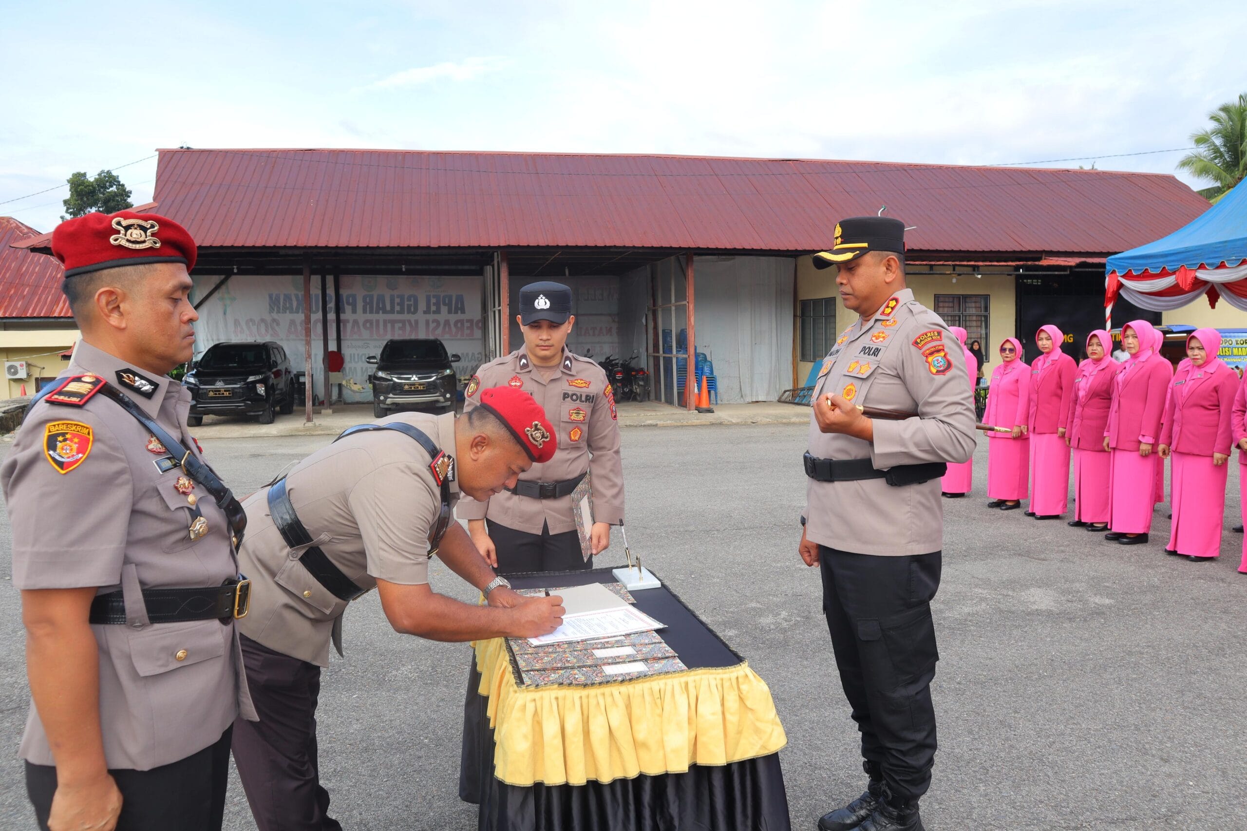 Hadir dalam Sertijab, PJU dan Kapolsek jajaran Polres Madina, pengurus Bhayangkari, dan seluruh personel disetiap satuan di Polres Madina, serta para undangan lainnya.