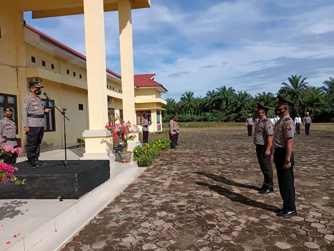 PALAS| Kapolres Padang Lawas ( Palas) AKBP Jarot Yusviq Andito SIK, meminpin upacara korps raport kenaikan pangkat setingkat bagi 17 orang anggotanya, (personel Polres Palas), di Plataran Kantor Mapolres Palas, Jalan lintas Sibuhuan – Sosa, Desa Bulu Sonik Kecamatan Barumun, Senin (5/7/2021).