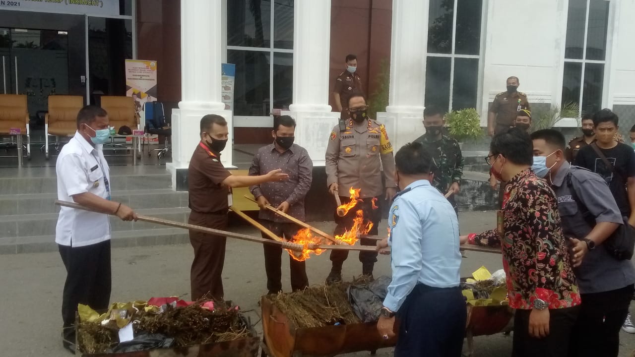 LANGSA | Kejaksaan Negeri (Kejari) Langsa, menggelar pemusnahkan barang bukti (BB) jenis narkotika (Sabu) dan daun ganja kering dari hasil putusan tetap pengadilan dari 58 perkara tindak pidana umum (Tipidum) di halaman kantor setempat. Kamis (4/2/2021).