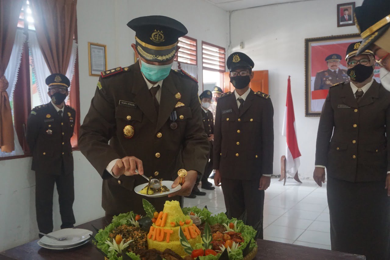 PALAS I Kepala Kejaksaan Negeri ( Kajari ) Kabupaten Padang Lawas ( Palas) Teuku Herizal SH, MH memotong nasi tumpeng peringatan Hari Bhakti Adhyaksa ( HBA) ke -61, tahun 2021, di ruangan Aula Kantor Kejari Palas, lingkungan VI, Kelurahan Pasar Sibuhuan, Kecamatan Barumun, Kamis (22/7/2021).