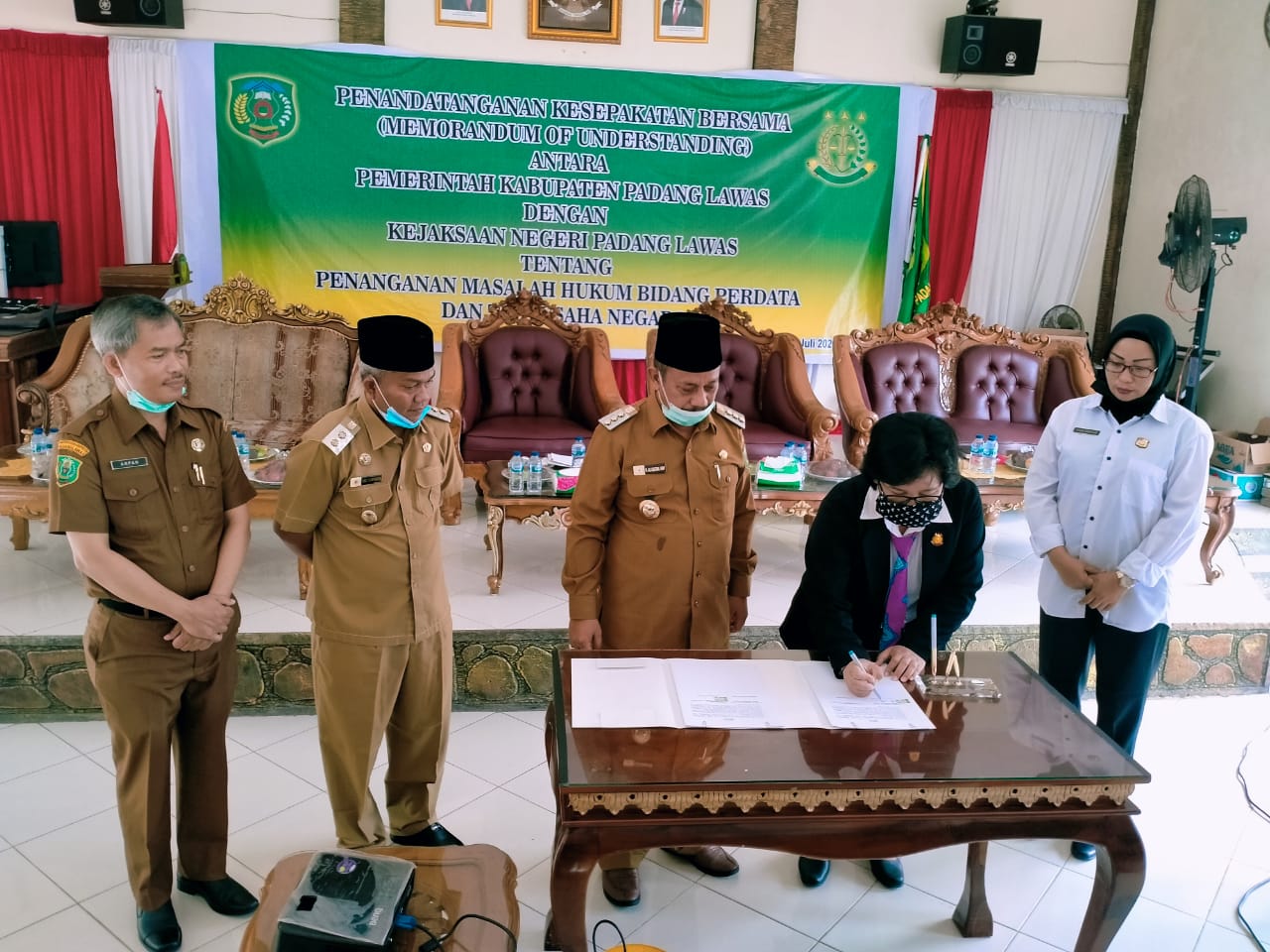 PALAS – Pemerintah Kabupaten (Pemkab) Padanglawas (Palas) melakukan penandatanganan kesepakatan bersama (MoU) terkait pendampingan hukum bidang perdata dan tata usaha negara (TUN), Senin (20/7/2020).