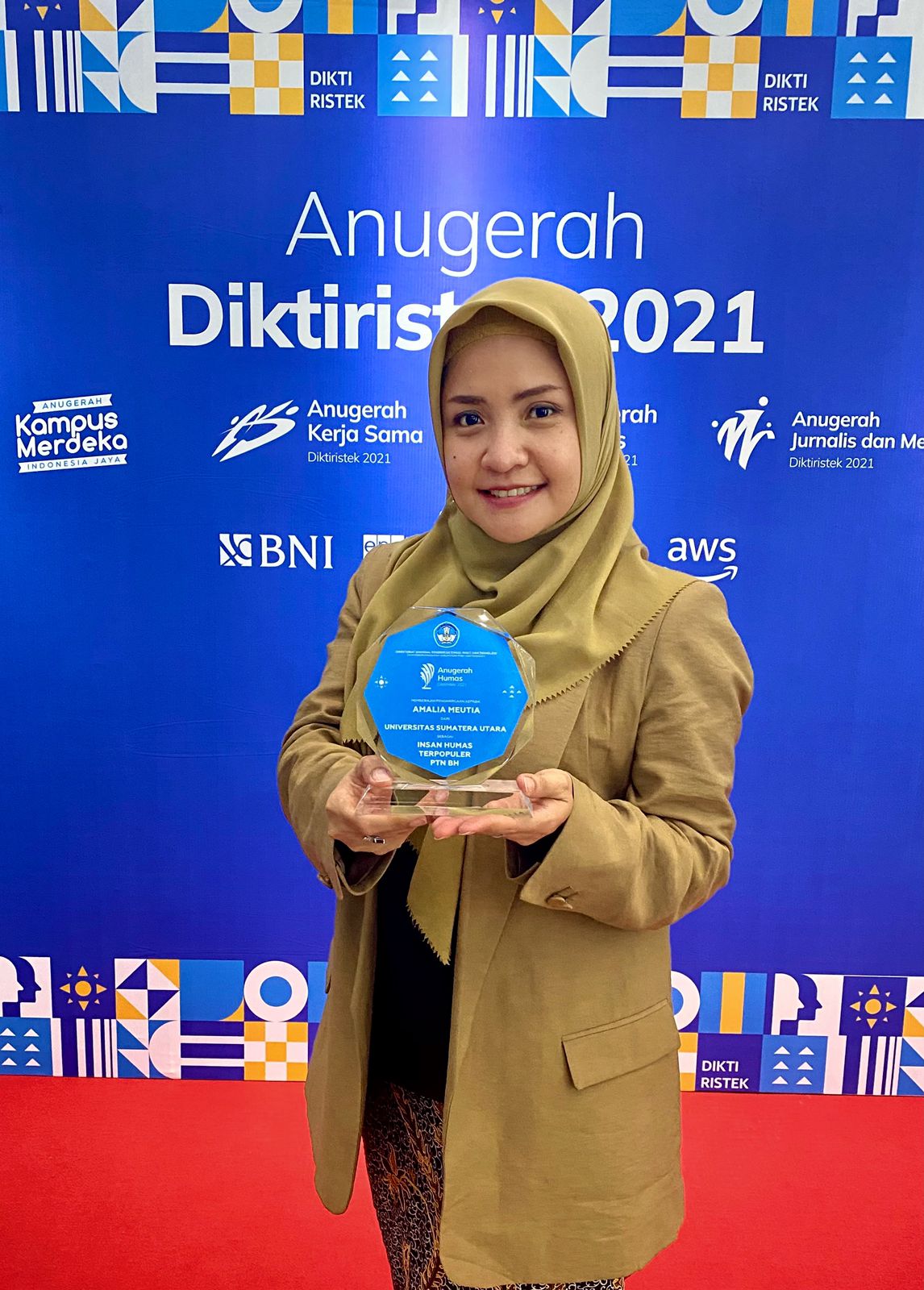 MEDAN I Kepala Humas, Promosi, dan Protokoler Universitas Sumatera Utara (USU) Amalia Meutia, M Psi, Psikolog, raih penghargaan sebagai Insan Humas Terpopuler Perguruan Tinggi Negeri Berbadan Hukum (PTN BH). Hasil itu diumumkan pada acara di Anugerah Humas Diktiristek 2021 yang diadakan Kementerian Pendidikan, Kebudayaan, Riset, dan Teknologi di Jakarta pada Kamis (13/01/2022).