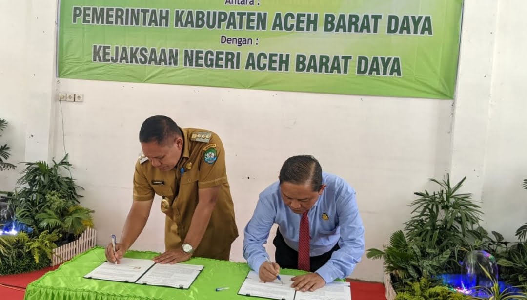 Pejabat (PJ) Bupati Aceh Barat Daya (Abdya) H Darmansah SPd MM menandatangani MoU Bidang Perdata dan Tata Usaha Negara dengan Kepala Kejaksaan Negeri (Kajari) Aceh Barat Daya Heru WIdjatmiko SH MH di Aula Kantor Kejari, Senin (10/10/2022)