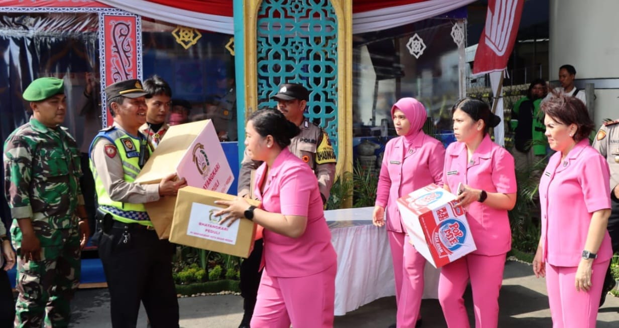 MEDAN | Ketua Bhayangkari Cabang Kota Medan Ny dr Ulivia Teddy Marbun didampingi pengurus mengunjungi sekaligus memberikan bantuan kepada personel Pos Pam Ketupat Toba 2024, Senin(8/4/2024).