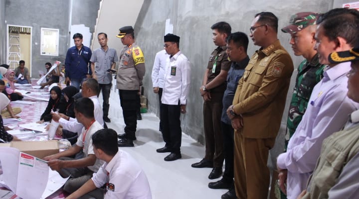 ACEH SELATAN | Pj Bupati Cut Syazalisma bersama Forkopimda Aceh Selatan secara perdana melakukan peninjauan pelipatan surat suara Pemilu 2024, Senin (8/1/2024) bertempat di area gudang Logistik Komisi Independen Pemilihan KIP Gampong Lhok Bengkuang Kecamatan Tapaktuan.
