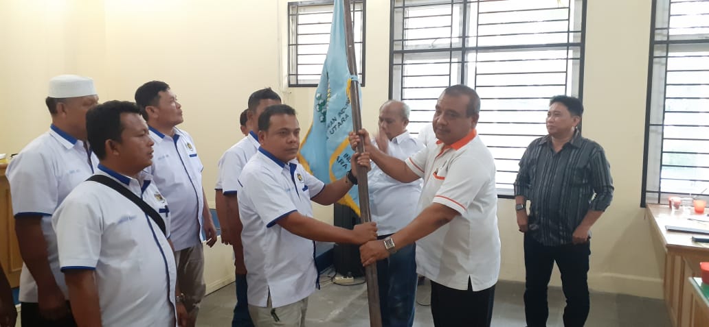 Ketua PWI Sumut Hermansyah menyerahkan bendera pataka PWI kepada ketua PWI Madina Terpilih M.Ridwan Lubis di Gedung PWI Jln Adinegoro, Medan, Selasa (8/10/2019)