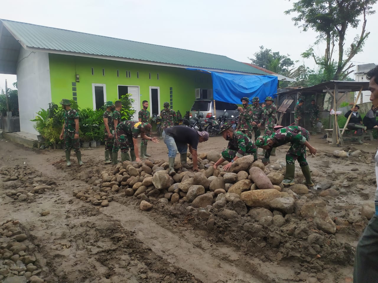 MEDAN-Sudah menjadi kearifan lokal warga dusun apabila setiap pekerjaan pasti mereka kerjakan dengan gotong royong, dalam pengerjaan bronjong warga membantu Satgas TMMD 109 Kodim 0201/BS dengan bergotong royong melansir batu.