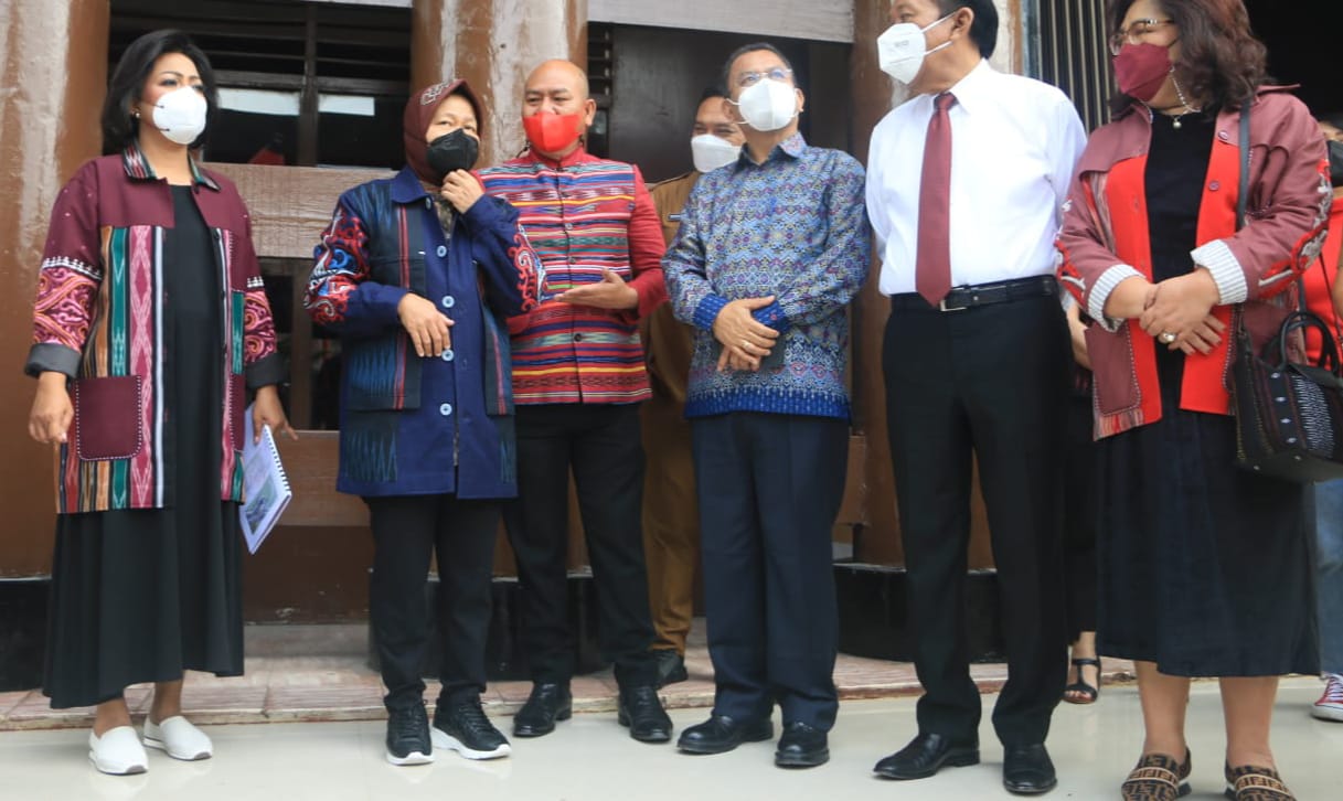 TAPUT | Bupati Tapanuli Utara, Drs. Nikson Nababan, M.Si bersama Sekda, Indra Simare-mare, Ketua TP. PKK, Satika Simamora, S.E., Wakil Ketua TP. PKK, Marsaulina Tobing beserta para pimpinan OPD, sambut dan gelar acara ramah-tamah kunjungan kerja Menteri Sosial Republik Indonesia, Tri Rismaharini di Sopo Rakyat Rumah Dinas Bupati Tapanuli Utara, Selasa, (4/1/2022).