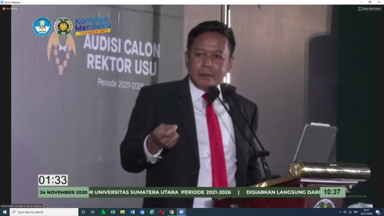 MEDAN – Dr. Muryanto Amin, S.Sos, M.Si menawarkan 6 usulan program unggulan saat Pemaparan Program Kerja Calon Rektor USU Periode 2021-2026 yang dilaksanakan di hadapan panitia penjaringan dan panelis, Selasa (24/11).