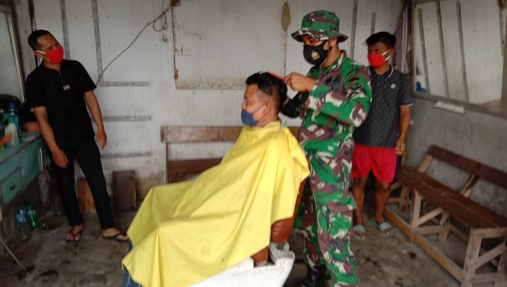 “Guna menjalin kekompakan dan keakraban Serda Mahendra sangat peka dengan warganya, salah satunya membantu Pak Paisal (26) memangkas rambut pelanggannya.