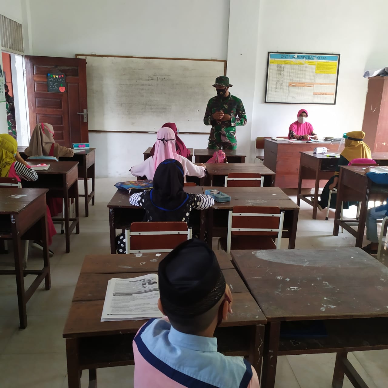 Seperti yang dilakukan oleh Serda Mahendra sedang mensosialisasikan tentang protokol kesehatan disalah satu sekolah pengajian.
