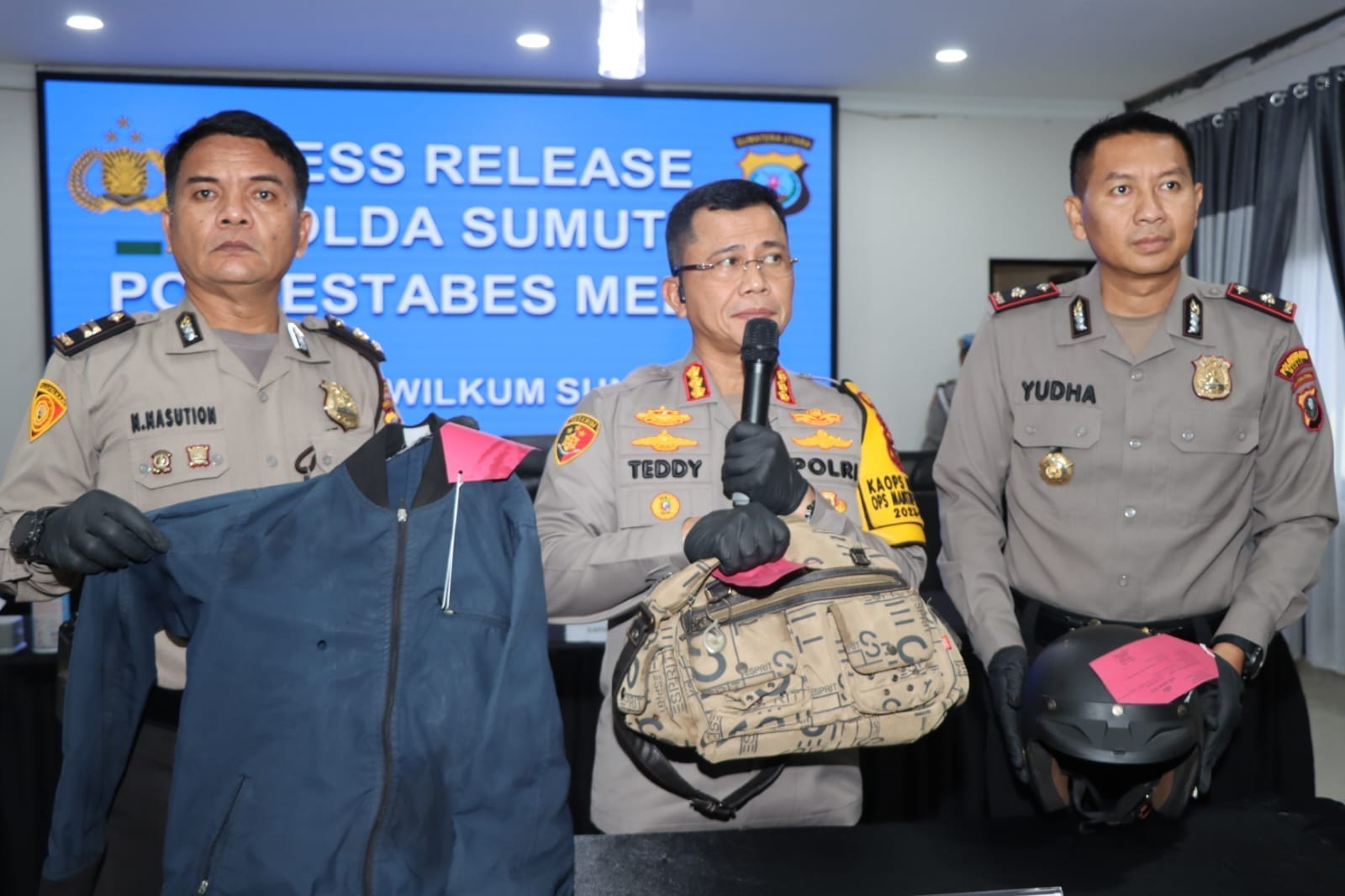 Kapolrestabes Medan Dr Teddy John Sahala Marbun didampingi Kapolsek Medan Sunggal Kompol Candra Yudha Pranata paparkan tindak pidana kejahatan Sabarullah alias Sabar dan Leonardo hingga tewaskan korban Eddy Suwito