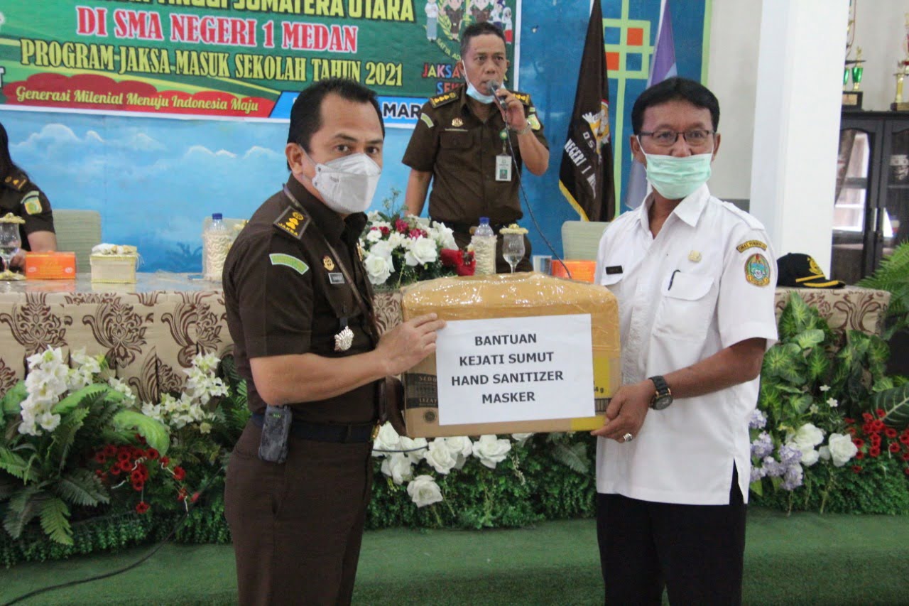 Kejati Sumut melalui Kasi Penkum Sumanggar Siagian juga menyerahkan bantuan masker dan hand sanitizer kepada Kepala Sekolah SMA N 1 Medan Suhairi, M.Pd dan pihak sekolah memberikan cenderamata kepada Kejati Sumut yang diterima langsung oleh Sumanggar Siagian dan diakhiri dengan foto bersama.rel