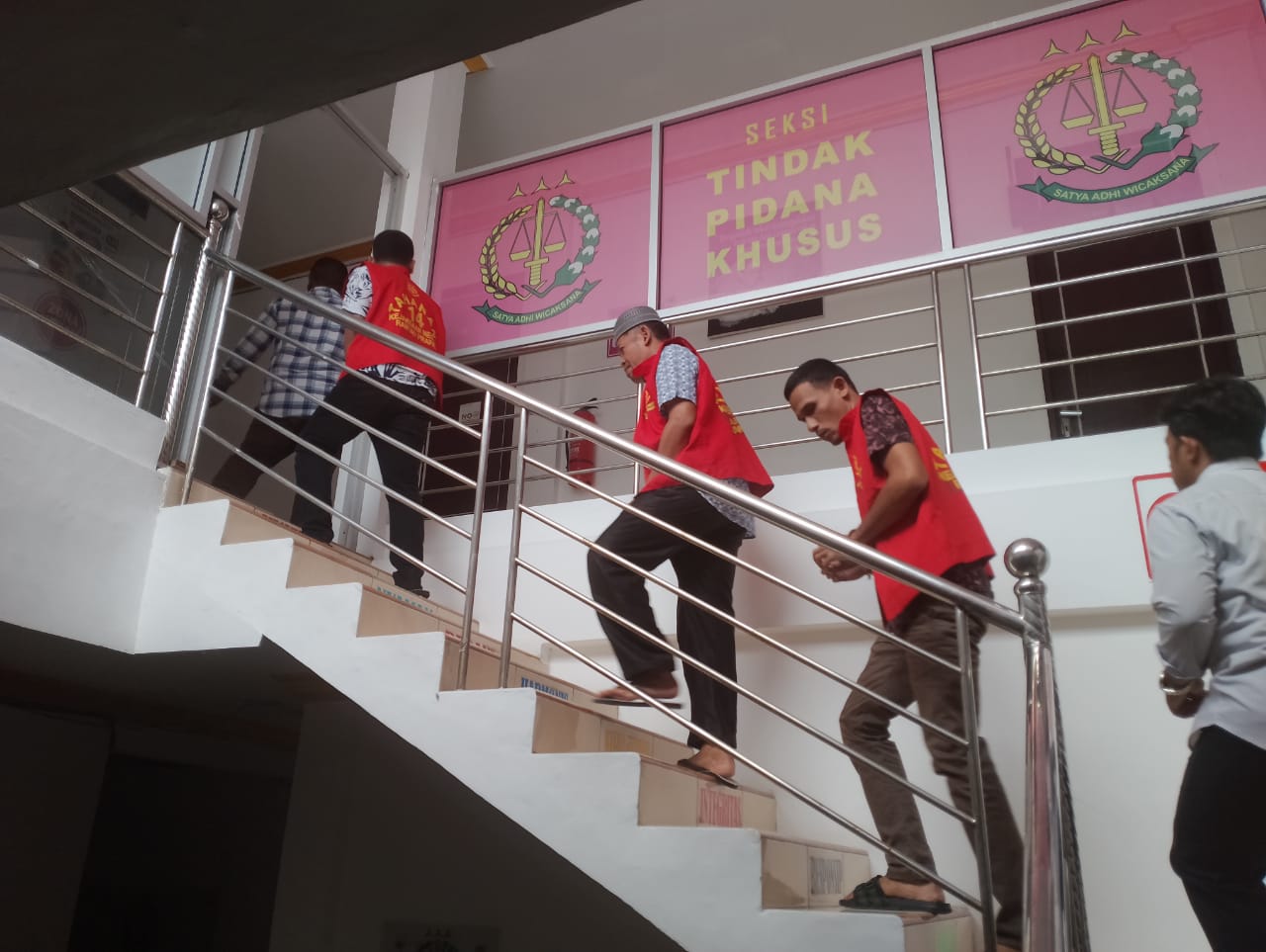 Terlihat 3 tersangka kasus dugaan tindak pidana korupsi di Disdik Kabupaten Labura naik ke lantai 2 Kejari Labuhanbatu untuk dilakukan proses tahap 2. (Foto/Ist)