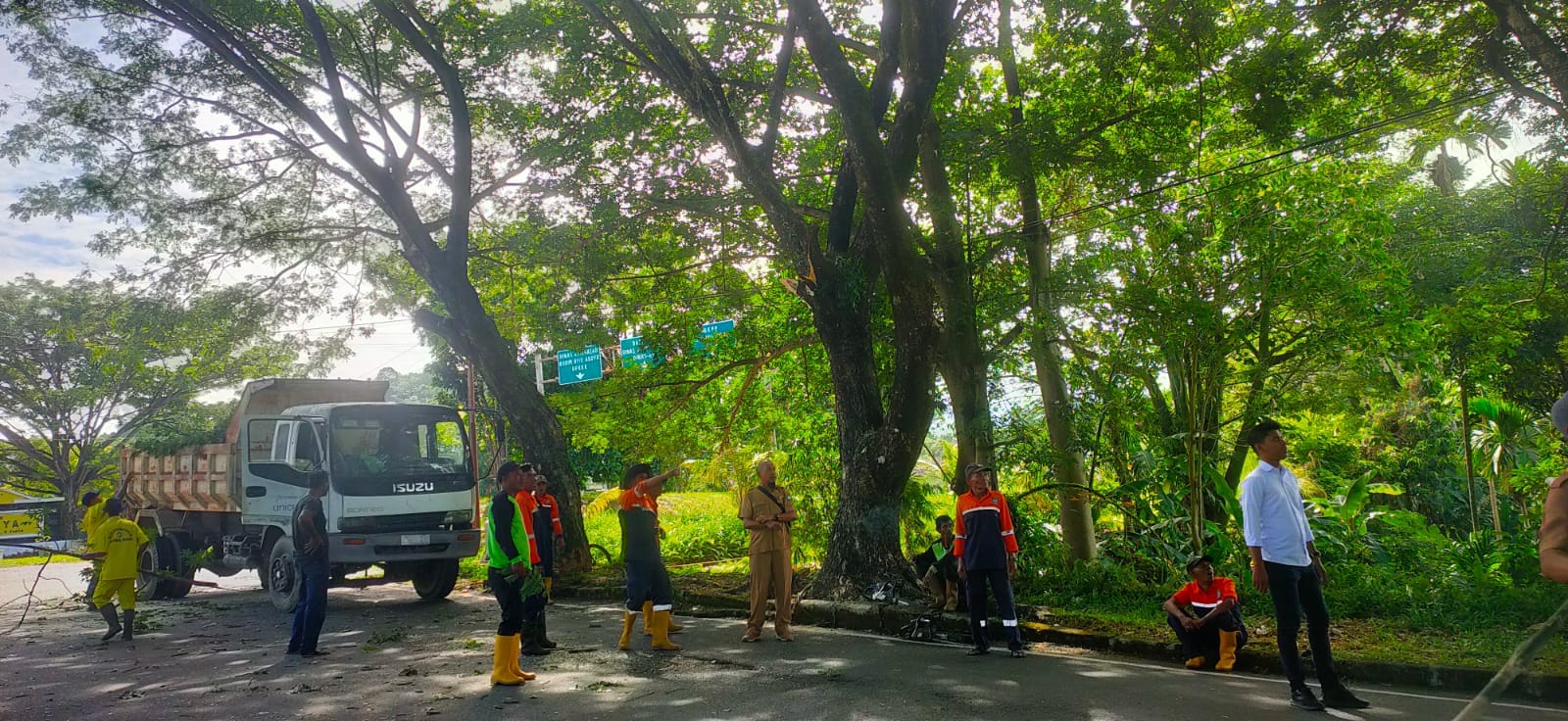 Plh. Pengendali Dampak Lingkungan/Subkoordinator Pengelola Sampah, Limbah B3 dan Peningkatan Kapasitas, Khairul Fauzi bersama staf dan petugas dari Dinas Perkim LH Abdya saat melakukan pemangkasan dahan pohon yang sudah tua dan lapuk, di jalan dua jalur menuju Perkantoran Bupati Abdya